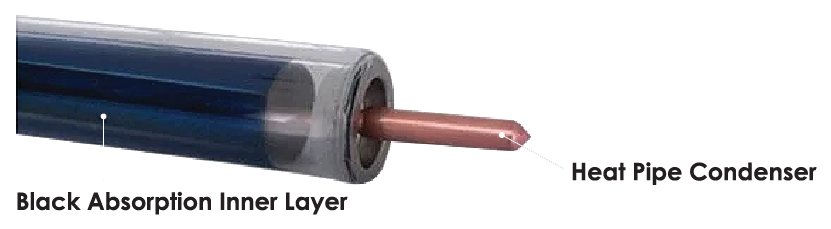 A solar vacuum tube works similarity in design to a coffee thermos. It consists of a two-layer glass with a vacuum in between the layers. The outer layer of the solar tube is made of borosilicate glass, which has very low iron content and allows 98% of light energy to pass through.